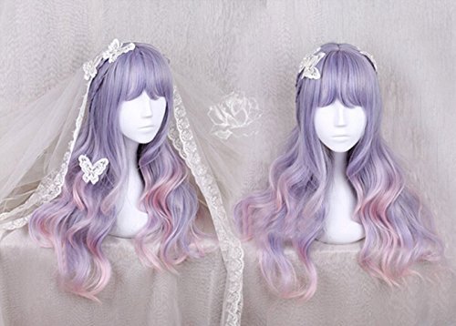 Women Girls Japan Harajuku Sweet Lolita Natural Looking Daily Wear Cute Fluffy Purple Blue Pink Ombre Healthy Long Curly Kanekalon Full Wig Cosplay