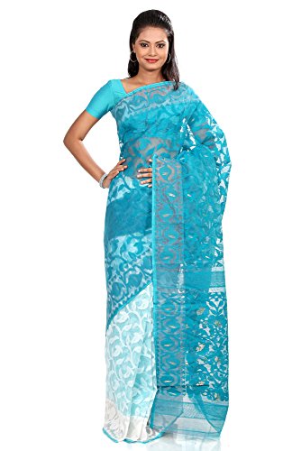 B3Fashion Women’s Traditional Ethnic Pure Dhakari Jamdani Silk Saree, Sea Blue