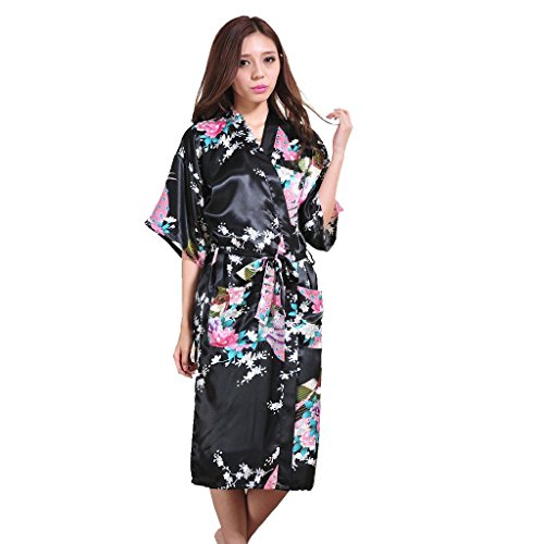 Honeystore Women’s Long Silk Kimono Robe Peacock Japanese Satin Dressing Gown