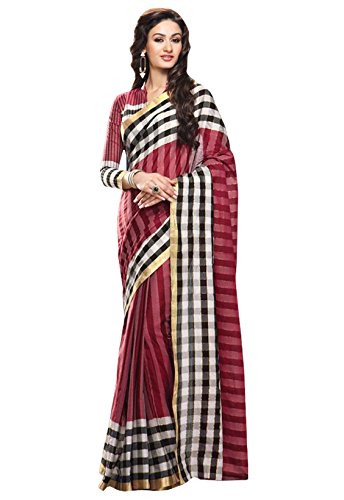 Shonaya Women’s Printed Cotton Silk Maroon Stripes Print Saree With Unstitched Blouse Piece