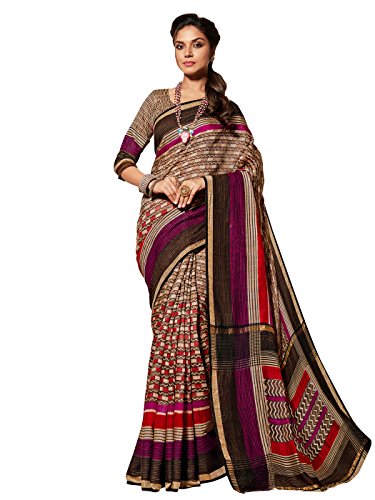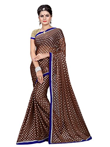 Shonaya Women’s Printed Lycra Brown Designer Saree With Unstitched Blouse Piece