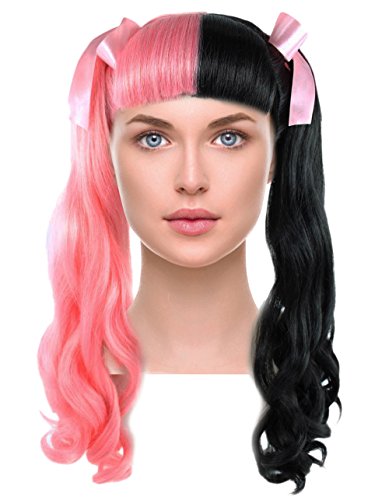 Two Tone Long Curly Ponytail Wigs with Bangs Ribbon Bows for Cosplay Halloween Party Pink and Black