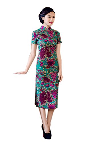 Green Jacquard Tea Length Chinese Qipao Dress, M