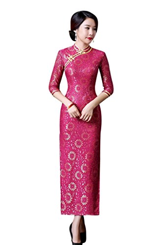 ACVIP Women Flower Lace Half Sleeve Two Side Slits Chinese Dress Qipao Cheongsam Rose Red
