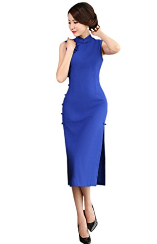 ACVIP Women’s Solid Color Sleeveless Cotton Linen Traditional Chinese Dress Cheongsam Royalblue