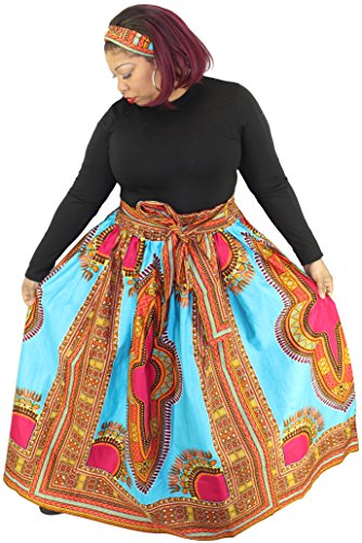 African Planet Women’s Wax Dashiki Skirt Bow Tie Elastic Waist Ankara Maxi (Turquoise)