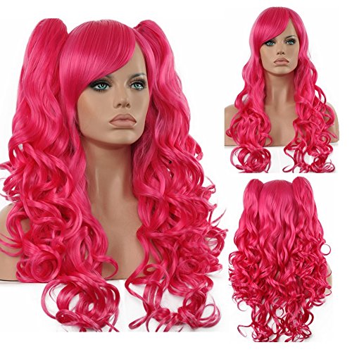 Diy-Wig Hot Pink Ponytails Wig Set Short Pink Wig with 2 Clip-In Cosplay Wig