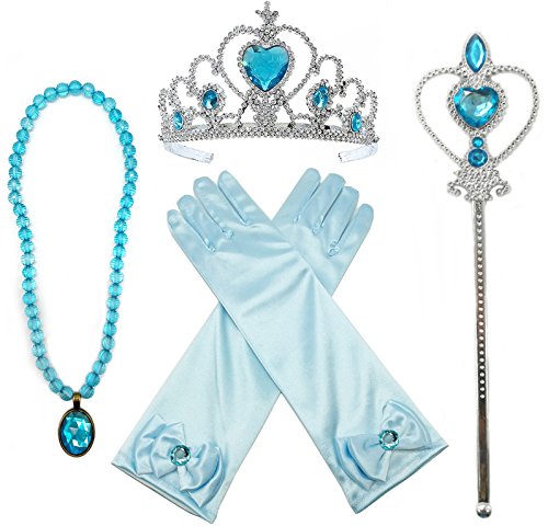 Princess Elsa Dress up Party Accessories 4 Piece Set Gloves, Tiara, Wand and Necklace(Lake Blue)