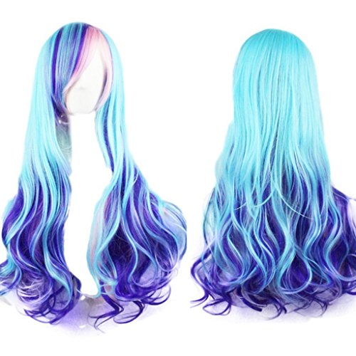 AneShe 28″ Gradient Wig Long Curly Synthetic Hair Cosplay Party Wig (Blue Mixed Pink)