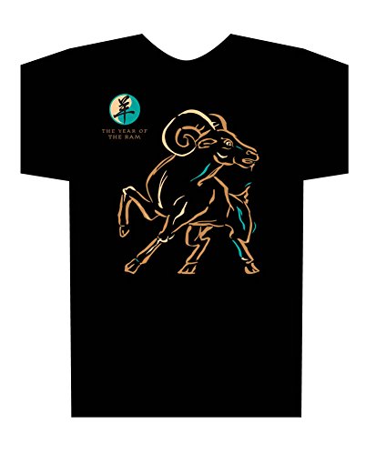 Asian Oriental Chinese Zodiac Neon-NRG Black T-Shirt – Year of the Ram: Birth years 1931, 43, 55, 67, 79, 91, 2003, 2015