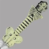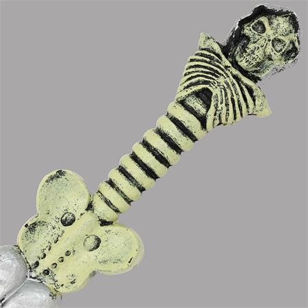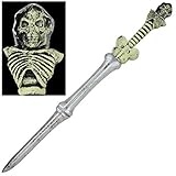 Constructed from high quality Polyurethane foam with a PVC inner core this piece has been hand painted. The skeletal handle is hand painted with a demonic skeleton guard with a hood. The blade is shaped from human leg bone and sharpened at the end making this a perfect demonic weapon. Weight 16 oz. Overall Length 38 inches. Please note that due to the material of this item minor pit or holes will be visible and paint may be smudged.