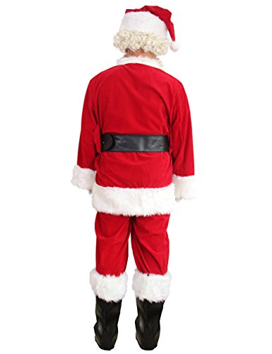 10 Pieces Complete Santa Suit includes: Red plush Santa zipper coat, Pants with Pockets, Signature Santa Hat, Belt with Buckle, Boot Tops with matching White Plush Cuffs, Gloves, Glasses, Wig, and Beard, Gold gift bag.