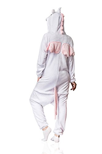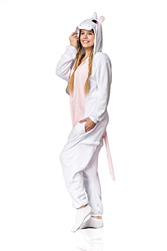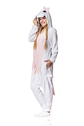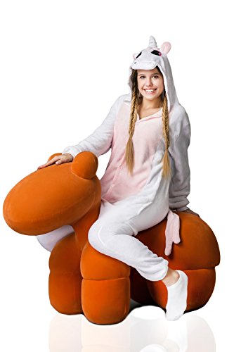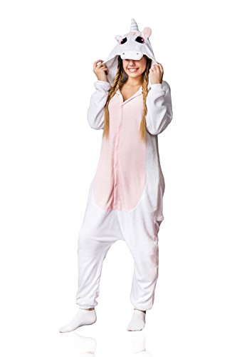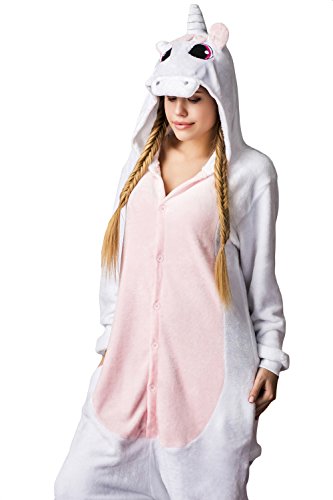 You can search high and low and still you won’t be able to find more gorgeous, magical and gentle creature than a unicorn. They’re supposed to be delicate and rare, true stuff of legends and fairy tales. But hooves? Hard and rather uncomfortable horn? Eating grass and sleeping outside even in the nastiest weather? No way. We think that fairy tale can be both magical and comfortable. And we got this amazing kigurumi to prove it. This pink and white one piece unicorn costume has long sleeves and long pants, two side pockets, front buttons and booty zipper. The buttons allow to get dressed quickly and the booty zipper makes visit to the restroom a hassle free task. The onesie pyjamas also feature little wings and a tail at the back. The comfortable jumpsuit is made of soft and thick plush fabric that will keep you warm and cozy. The wrist and ankle cuffs on all of our kigurumi are elasticized. The kigurumi is made to fit body loosely, so you can wear layers of clothing underneath which making it ideal for cold autumn and winter nights. The loose fit provides another benefit – the costume doesn’t restrict your movements, giving you the freedom to sleep, dance or just fool around as you please. This comfy sleepsuit will be a hit at any party, cosplay event or pajama sleepover. Being memorable and unique it will make you stand out in any crowd! And if you are in no mood for a party simply use the kigurumi as a warm homewear or sleepwear. WASHING. When washing your kigurumi onesie for the first time, we recommend using the gentlest setting on your washing machine, cold water and any laundry detergent. For subsequent washes you may use warm water. Fabric softener is optional. Never use chlorine bleach. Hang kigurumi to dry or use the most delicate setting on your dryer (usually air dry/fluff air, a setting that uses room temperature air).
