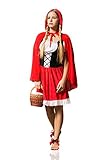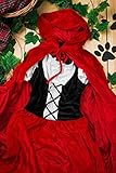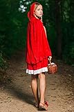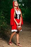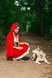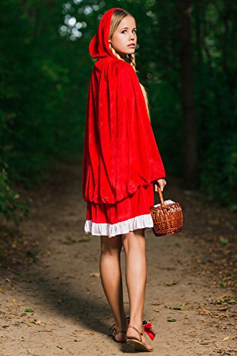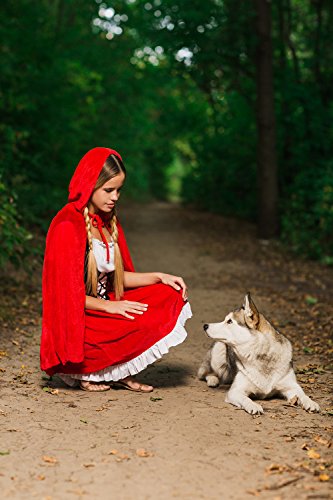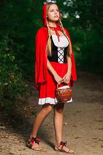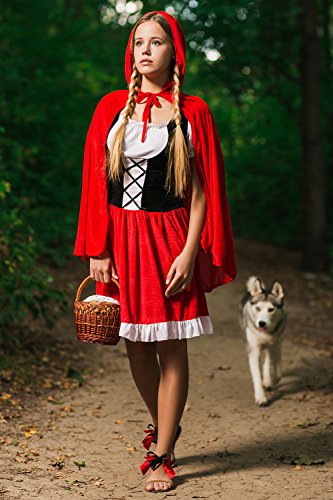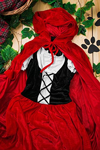Everybody knows the classic fairy tale about Red Riding Hood and big bad wolf. In fairy tales even the the ordinary visit to grandma’s house can turn into a dangerous adventure. But don’t worry, you don’t have to brave deep forests full of dangerous wild animals and other unsavory aspects of childhood story heroine to wear this utterly charming outfit. Become the Red Riding Hood who is so lovely that even the baddest wolf will be distracted and will let you pass unnoticed and safe. Or not. But in the latter case you can be sure that his attention will be flattering and not threatening. So let’s create a different ending of the famous story and in our version the villainous wolf will be defeated not by the hunter but with by smile. The ensemble features a fit and flare dress. The bodice laces up with black ribbon giving the appearance of a corset over a white peasant style blouse. The dress has scoop neckline on the elastic band and short puff sleeves. The skirt is red with a white trim at the bottom. And since there’s no such thing as Red Hood without her cape, we included in the set a long red hooded cape on ties. Make your storybook character look even more real by adding a pair of pretty flats and a basket. Now you are all set to go, be it grandma’s house or a party. Pair up with a wolf costume for a great couples look!