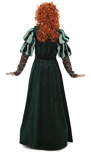 Brave “Merida” Forest Princess Adult Costume This high-end costume is made with a textured velvety deep green fabric featuring finished hems. Faux leather covers the lower arms and ends with a delicate point to cover the top of the hands. Faux fur and brocade trim accents the front and waist. A hoop skirt hidden beneath will make any girl feel like a princess! An elastic waistband allows for pull-over entry. Theatrical/performance quality. A spectacular costume! Includes: – Dress