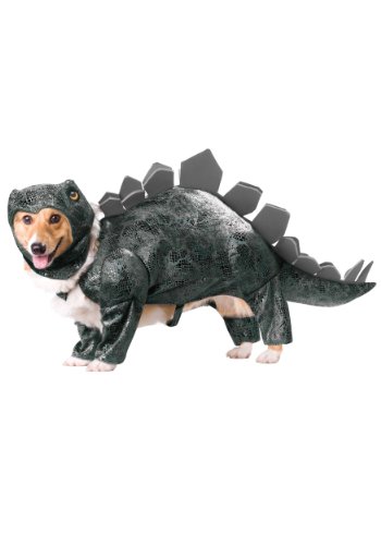 A plated prehistoric pet. Stegosaurus costume includes foam headpiece and padded green jumpsuit with attached spinal plates and tail.