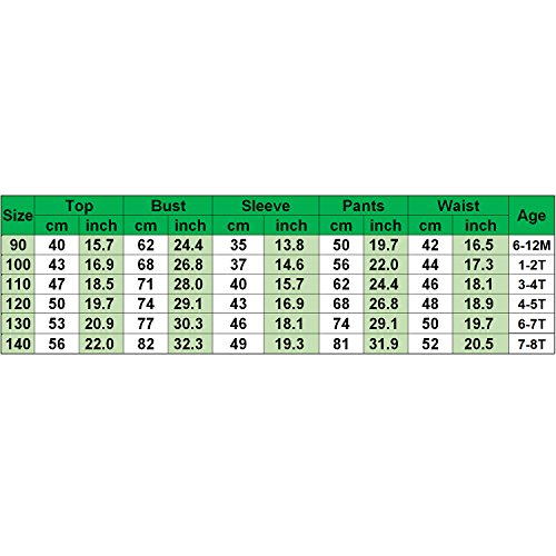 Size for 1-2T—Top:16.9″–Bust:26.8″–Sleeve:14.6″–Pants:22.0″–Waist:17.3″