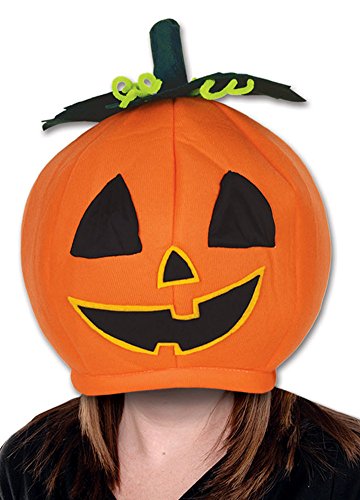 Plush Pumpkin Head Hat. This is a fabric hat in the shape of a pumpkin with a face. It is one size fits most. This hat can be worn covering the head or on top of the head. It is a fun hat to wear for Halloween.
