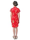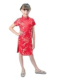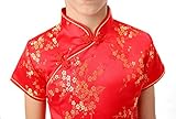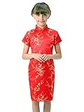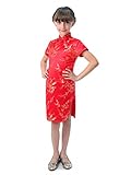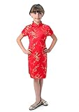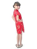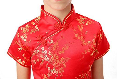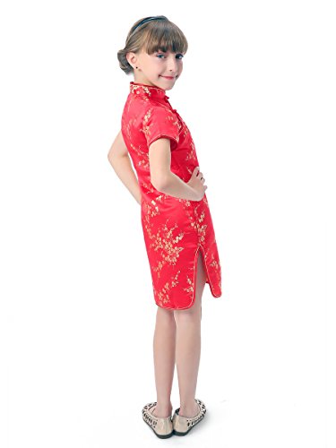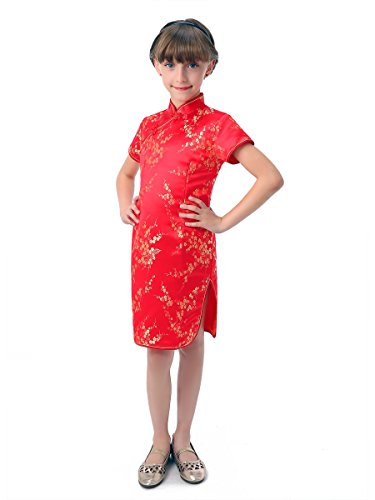 Well-made Chinese brocade qipao dress for girls in vivid red color with the Chinese traditional wintersweet blossoms fabric patterns which symbolize in the Chinese culture the spiritual strength enduring adversity and hardship… Red is a traditional color of happiness symbolizing good fortune and joy. It is found everywhere during Chinese New Year and other holidays and family gatherings. Experience the Chinese culture by bringing home this gorgeous dress!
