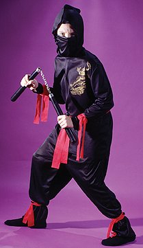 - Choose this kids ninja costume in black or white. Each ninja costume includes a red belt and ties.