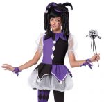 This girl jester costume includes a dress, tights, wrist cuffs and mini jester hat.