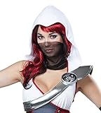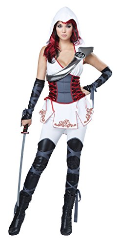I always get my target. The sexy ninja in white costume features a hooded tunic top with an attached corset styled piece. It comes included with a pair of two toned pants with attached wrap ties, a pair of arm wraps with attached ties, a shoulder guard piece and a sheer mask. Shoes and sword not included.