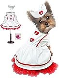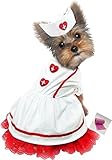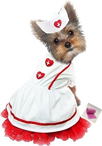 Victorian styled Classic Sweetheart Nurse and Hat Costume with bags for Dogs. Available in Sizes XS thru L. Adorable Nurse’s dress uniform for your little Florence Nightingale, includes stiff Nurses Hat., and one roll of clean up bags. Features: Red banded trim, lace trimmed apron, red hearts red cross appliques,Perfect little dress costume for theme parties, holidays, special events playtime, halloween to brighten up any rainy day. Color: White/Red. Available in Sizes: (XS – Chest 10.5″-12″, Neck 6-7.5″, Back 8″ L, 3-5Lbs.) (S – Chest 12-14″, Neck 7.5-8.5″, Back 9.25″L, 6-8Lbs.) (S/M – Chest 14-16″, Neck 8.75-10.5″, Back 10.75″ L, 9-11 Lbs.) (M – Chest 16-18.5″, Neck 10.5-12″, Back 12.5″L, 11-14Lbs.) (L – Chest 18.5-20.5″, Neck 12-13.5″, Back 14″L, 15-20Lbs.)