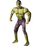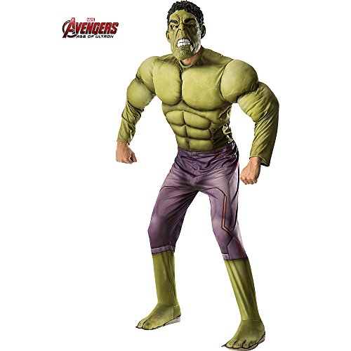 This deluxe Hulk dress grownup sized features a padded muscle chest jumpsuit with connected shoe covers and a Hulk masks.