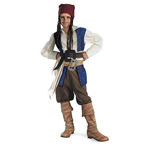 This Jack Sparrow Classic Costume features a shirt with attached vest, fabric sash, two belts with attached buckles, pants and bandana with beaded braids.