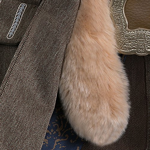 Vest features allover print, faux brass buttons, and attached faux undershirt collar|Faux leather and snakeskin belts with buckles, one with attached faux fur tail|Striped waistband with faux pouch|Pants feature elastic waistband