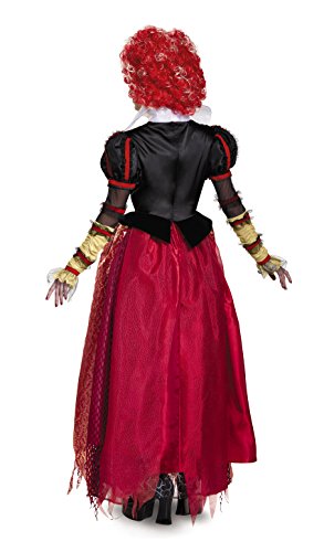You can rule underland as the beautiful but villainous red queen in this jaw-dropping red queen prestige costume. This stunning full-length dress features an attached petticoat and zippered closure; a variety of trims, jewel embellishments, high-quality multi-fabric construction and character-accurate printing on the bodice and skirt bring the red queen to life