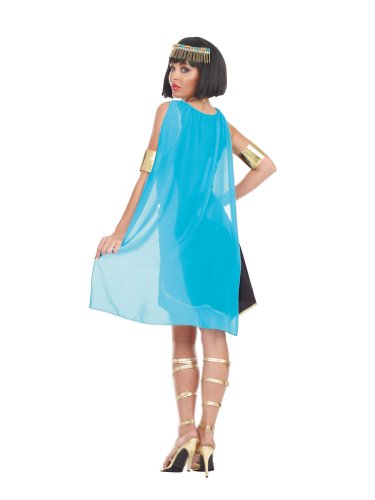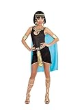 Black dress with gold foil trim, beaded neckline and attached turquoise cape. Matching beaded headpiece, waist sash and gold adjustable arm cuffs included. (3 piece set)