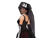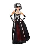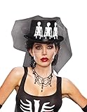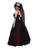 By day she sleeps 6 feet deep. By night she does the graveyard creep. You will be the vision of exquisite, ghoulish delight in this skeleton screen print dress with full-layered tulle and skeleton fingerless gloves. Includes black top hat with skeletons and attached long tulle veil.