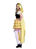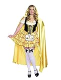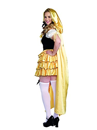 This bed hopping beauty went through life without cares, until she had a little tangle with three angry bears. Be a true storybook beauty this season when you dress in this adorable gold and black fairytale dress with corset-styled bodice, sequin bear trim, ruffled skirt, and long hooded satin cape.