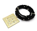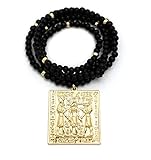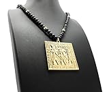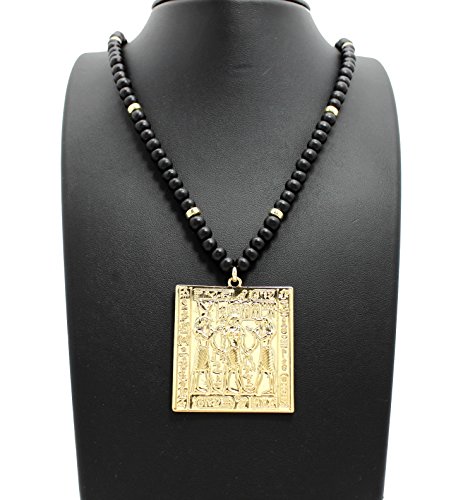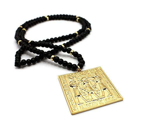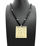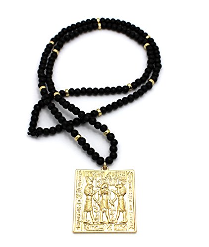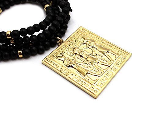 Egyptian Tablet Pendant 6mm 30″ Wooden Bead Necklace in Gold Tone