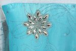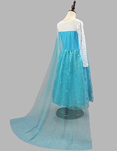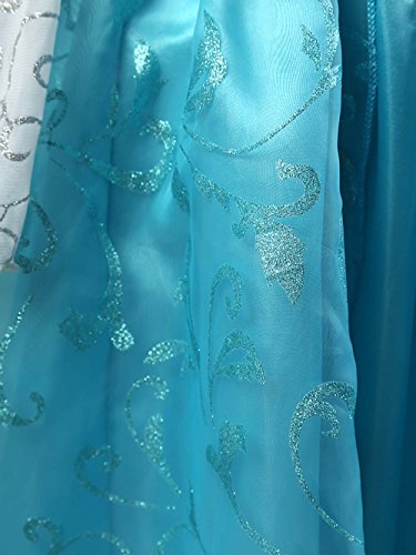 Elsa costume inspired by Disney Frozen. This dress has long sheer sleeves and shoulder coverage. Silver glitter pattern on sleeves. Crystal gem on neckline.
