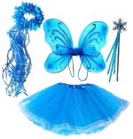 Your little princess will feel like Ilse from Frozen in this adorable 5 piece set. The bright, shimmery tutu has a soft satin waist band and measures 12″ in length. The wings have shimmery blue sparkles and are a perfect match to the tutu. Wings measure 15″ wide and have a sturdy frame. The snowflake wand is sturdy and fun and has dangling ribbons. The halo adds a beautiful touch that she will want to wear with other outfits.