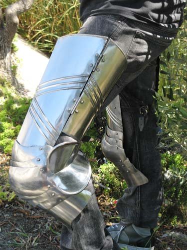This full length leg armor measures approximately 25″ tall and approximately 12″ wide. Perfect for wear or as a display piece. They are finished with chrome plated steel.