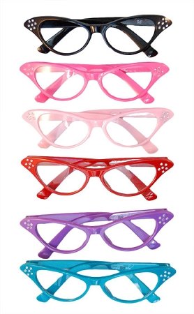 CAT EYE GLASSES – These vintage fifties glasses look just like the cateye prescription glasses worn all through that decade, but instead are non-prescription clear plastic. Easy to see through, good plastic material, and sized specifically for children. Included in the design are beautifully accented rhinestones to make the glasses and your costume pop!