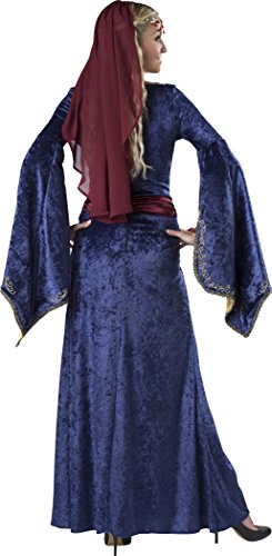 In a full-length velvet dress with embroidered bodice, chiffon veil and jeweled headpiece and buckle, it’s clear why this lovely lady caught robin hood’s eye.