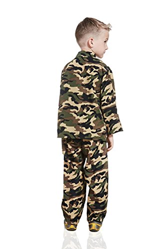 The outfit includes khaki-coloured jacket with long sleeves and 4 flap pockets. It fastens with several golden buttons on the front. The loose pants of the matching camo color have an elastic waistband that makes them comfortable to wear. This costume will turn your boy into a hero a star of any Halloween party.