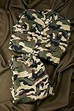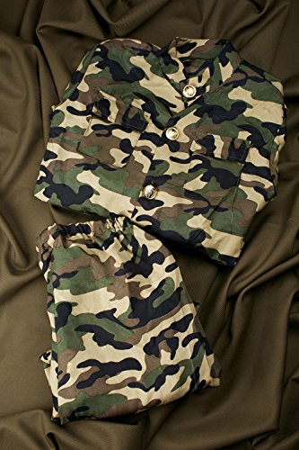 Cosplay costume includes military camouflage jacket with four flap pockets. matching camo pants.