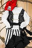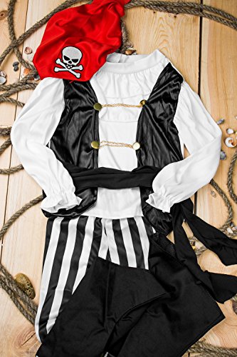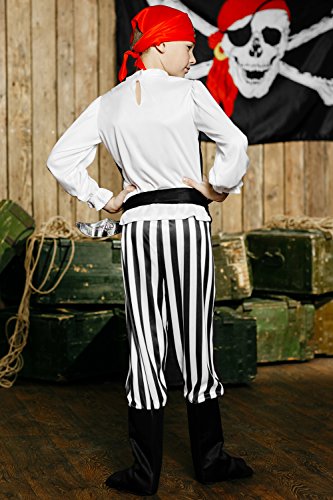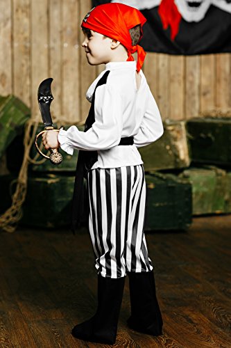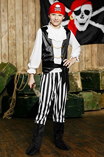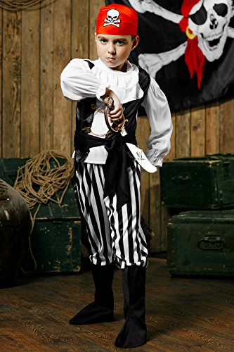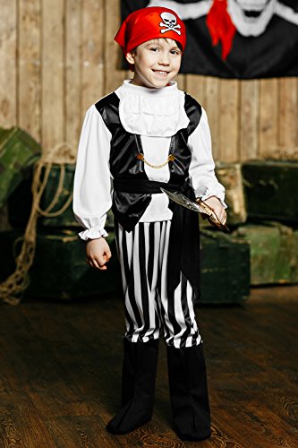 The world is huge and all children love to explore it by playing and trying on different roles. And Halloween is the best time to dress up and pretend. Your boy won’t need to sail far and away to smell the salty winds of adventure. This costume will let him become the merry member of the crew worthy of the Black Pearl. Let him captain the party and rule the waves of fun this fall. A costume features an elegant white shirt with an attached vest, pants with boot covers, a waist sash and a bandana. The classic white long sleeved pirate shirt with jabot will make your boy the most elegant and stylish sea dog out there. Attached vest panels are made of shiny black fabric and decorated with gold buttons and chains. Black boot covers are attached to the striped black and white pants with elastic waist. A black sash and a red head scarf with the ‘Jolly Roger’ emblem top off this perfect Pirate Costume. You can add an eye-patch, pirate daggers or cutlasses, a classic pirate hook and a fake beard. With all these accessories your little pirate captain won’t need to steal the candies because he will capture all the hearts with a single smile. No one will be able to resist such a charming privateer.