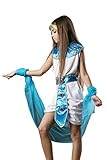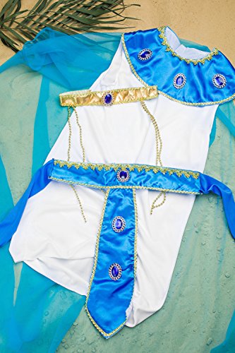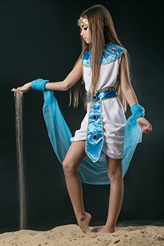 The Kingdom of the Nile has got a new leader! Don’t think your daughter is too young for the Egyptian throne. Great queens Nefertiti and Cleopatra were not considerably senior to modern schoolgirls when they started ruling over Ancient Egypt. These women became the icons of female beauty. And the name Nefertiti even stands for “The beautiful one has arrived”. Together with his husband, pharaoh Amenhotep IV she saw the wealthiest times of Egyptian history. In this simple but marvellous cosplay costume your daughter will easy put herself in the Egyptian empress’s place at the start of her reigning, The outfit features a short white sleeveless tunic adorned with a blue satin collar and a matching Egyptian belt. The accessories boast gorgeous gold trim and sparkling faux gems. The head of the young queen is crowned with a gold beaded headdress that has the similar faux gem on the front. A mesh blue cape not only protects the empress from the hot sun but also gives the unique royal look to the whole attire. To complete the costume of your little queen you may need exotic make-up, a pair of Egyptian style sandals and a plastic staff that will help her to rule and to walk around her enormous palace. With all this additional accessories she will become as pretty and powerful as both Nefertiti and Cleopatra.