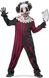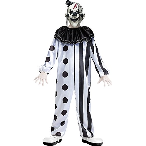 Killer Clown Kids Costume includes black and red jumpsuit, collar stained with faux blood and clown mask with black hair. This creepy Clown Costume for boys is available in kids sizes Medium (8-10), Large (10-12) and X-Large (12-14). Bring an extra air of horror to your next costume party!Please note gloves, shoes and toy axe are not included.