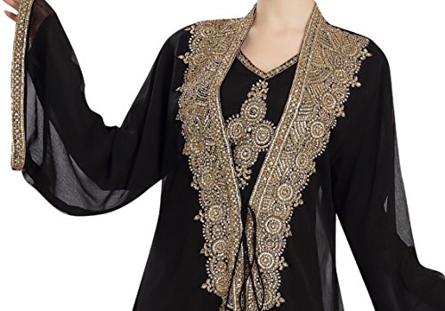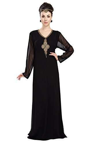 This Eye-Catching Elegant Is Perfect for Any Occasion, with the Golden color beads & sequins.This hand Embroidery dress Keeps Ahead in the Fashionable Kaftan industry.This Black Color Georgette Kaftan is an Original Maxim Creation design and will be made to order. 2 Piece Set & Full Sleeve Kaftan Dress + 1 Head Scarf . From time to time beading may become displaced due to usage and this is not regarded as a fault but is due to the nature of the work. The dress is completely hand made. These garments should be worn with care. Heavily embroidered items can only be DRY-CLEANED. We cannot be liable for any damage to your garments due to non-compliance with these instructions. Comes with a matching inner.