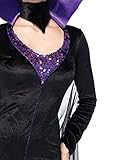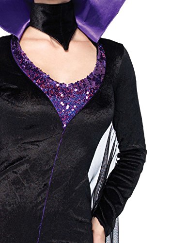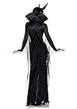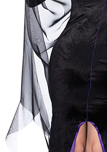 Maleficent costume featuring long-sleeve dress with front slit and mesh cape
