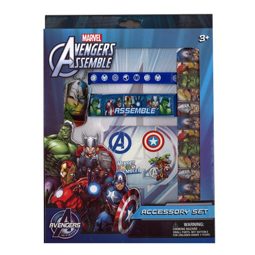 Marvel Avengers Superheroes box set. Includes a slap bracelet, a dog tag, two printed rubber bracelets and stickers. Suitable for all children ages 3 and up. Comes packaged in a box featuring many of your favorite Marvel Avengers.