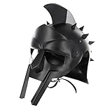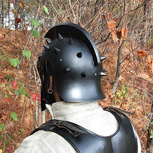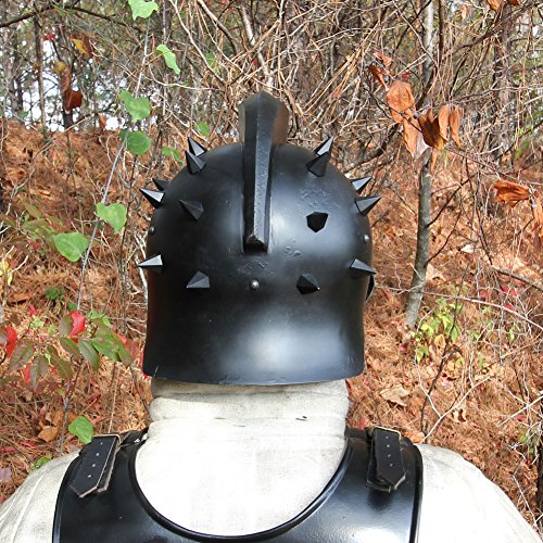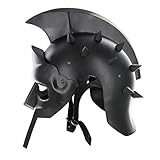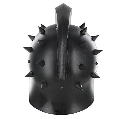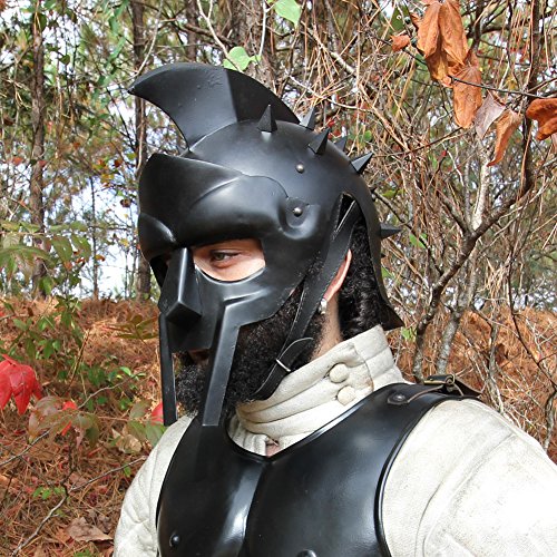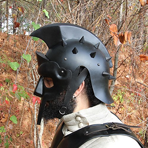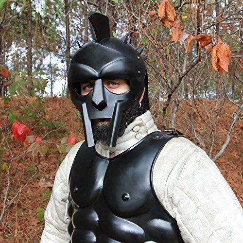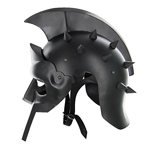 The Roman Spaniard Gladiator, Maximus, was famous as a General fit to be king. A dying Roman Emperor wished to grant Maximus with temporary power over Rome. Upon the death of the Emperor, Maximus was betrayed and cast into slavery. Maximus was sold into the Roman Gladiator Arena where he climbed to power. Eventually, he obtained vendetta and killed the Roman leader in an arena battle, bringing change to the Roman Empire. The Maximus Roman Gladiator Blackened 18g Helmet is constructed of blackened 18 gauge steel with a soft adjustable leather liner. The chip strap is also adjustable with a steel buckle to secure your helmet on. Don your helmet as you head out into battle and take your revenge. The protruding spikes will surely strike fear in your enemy’s hearts. This helmet is also a perfect touch for costumes involving movies, re-enactments, and on stage performances, or just the run of the mill Halloween costume.