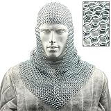 Medieval protection for the head used mainly from the 11th to the beginning of the 14th century. It consisted of a close fitting mail hood extending down to cover the neck and parts of the shoulders, occasionally attached to the hauberk. The mail coif was made in the same manner at the mail hauberk or shirt. Often worn over a padded coif and under a helmet however in numerous medieval illuminated manuscripts knights and soldiers are shown with just the mail coif protecting the head. Our historically accurate mail coif is made from high tensile wire. The coif is made using the European 4 in 1 pattern of 9 mm butted links and is constructed with 16 gauge zinc plated mild steel.